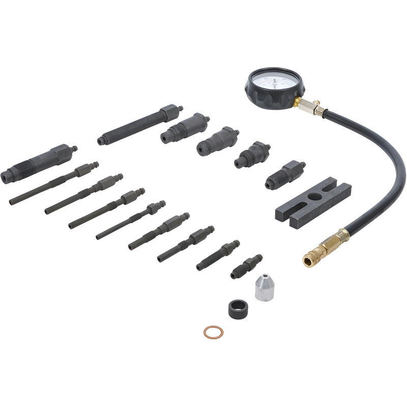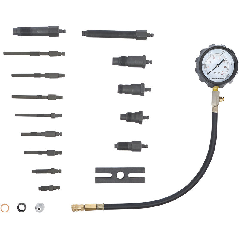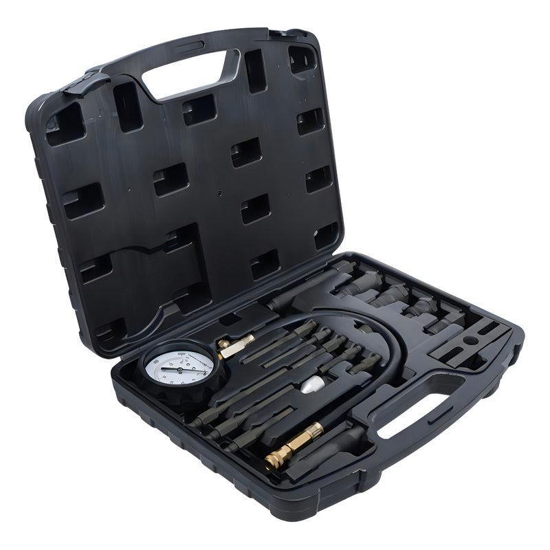 Probador de compresión para motores diésel diseñado para evaluar el estado del motor de manera profesional. - Incluye herramientas de prueba compatibles con la mayoría de vehículos: Manómetro de 70 bar con manguera de 500 mm Tubo adaptador M18 x 1.5, longitud: 160 mm - Adaptadores de inyector: M20 x 1.50, longitud: 77 mm M22 x 1.50, longitud: 74 mm M22 x 1.50, longitud: 117 mm M24 x 1.50, longitud: 88 mm M24 x 2.00, longitud: 66 mm - Adaptadores para bujías: M8 x 1.0, longitud: 104 mm M10 x 1.00, longitud: 84 mm M10 x 1.00, longitud: 92 mm M10 x 1.00, longitud: 113 mm M10 x 1.00, longitud: 120 mm M10 x 1.25, longitud: 65 mm M10 x 1.25, longitud: 137 mm M12 x 1.25, longitud: 48 mm