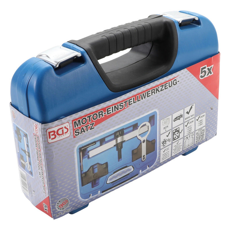 BGS es sinónimo de calidad y confianza. Con más de 45 años de experiencia, ofrecemos herramientas automotrices y ferreteras innovadoras y duraderas. Nuestra amplia gama de productos garantiza un rendimiento superior en cada proyecto. NOMBRE DEL ARTÍCULO: KIT DE SINCRONIZACIÓN | PARA BMW N63 Descripción: para ajustar la sincronización del motor durante el cambio de la cadena de distribución, la reparación de la culata, la sustitución de la junta de culata, etc. Contenido de suministro: herramienta de bloqueo del cigüeñal, para ser utilizado como OEM 118570 / 119190 herramienta de bloqueo del árbol de levas, para ser utilizado como OEM 119890 tornillo moleteado, para ser utilizado como OEM 119891 barra de presión, para ser utilizado como OEM 119892 calibre hembra para árbol de levas de admisión y de escape, para ser utilizado como OEM 119893 espaciador, para ser utilizado como OEM 119894 Datos tecnicos: Número de modelo | SKU: 62627 Diseñado en: Alemania Marca: BGS Peso bruto: 2758 g Para usar como equipo original (OEM)1: 11 8 570 | 11 9 190 | 11 9 890 | 11 9 891 | 11 9 892 | 11 9 893 | 11 9 894 BMW