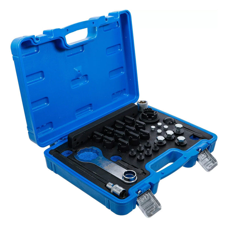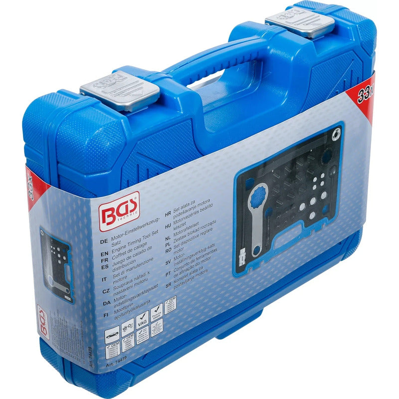 BGS es sinónimo de calidad y confianza. Con más de 45 años de experiencia, ofrecemos herramientas automotrices y ferreteras innovadoras y duraderas. Nuestra amplia gama de productos garantiza un rendimiento superior en cada proyecto. NOMBRE DEL ARTÍCULO: KIT DE SINCRONIZACIÓN | PARA VW / PORSCHE EA839 DESCRIPCIÓN Para controlar y ajustar la sincronización del motor. Adecuado para motores VAG EA839. Códigos de motor: 2.9 / 3.0 TFSI (DECA, CWGD, CZSA, CZSE, DCBD, DLZA). Instalado en los siguientes modelos de vehículos: Porsche Panamera II (11/2016-), Cayenne III (08/2017-), Macan (12/2018-). Audi S4 B9 (11/2016-), S5 F5 (07/2016-), S6 C8 (07/2019-), S7C8 (07/2019-), RS4 B9 (11/2017-), RS5 F5 (06/2017-), SQ5 FY (06/2017-), A6 C8 (01/2019-), A7 C8 (02/2018-), A8 D5 (09/2017-), Q7 (09/2019-), Q8 (02/2019-). VW Touareg (04/2018-). CONTENIDO DE SUMINISTRO: 1 Juego de herramientas de bloqueo del árbol de levas, para usar como OEM T40331, /1, /2, /3, /4, /5, /6, /7, /8, /9, /10. 1 Inserción de dado, E24 para ajustador de árbol de levas. 1 adaptador para herramienta para sujeción de ajustador de árbol de levas, para usar como OEM T90002. 1 herramienta para sujeción del ajustador de árbol de levas, a usar como OEM T90001. 1 Pasador de fijación del cigüeñal, para usar como OEM T40069. 1 Pin de bloqueo para polea de cigüeñal, para usar como OEM T40264 1 Punta de vaso T52, entrada de 12,5 mm (1/2”), longitud de 200 mm. DATOS TÉCNICOS Número de modelo | SKU: 74439 Diseñado en: Alemania Marca: BGS Peso: 4912 g