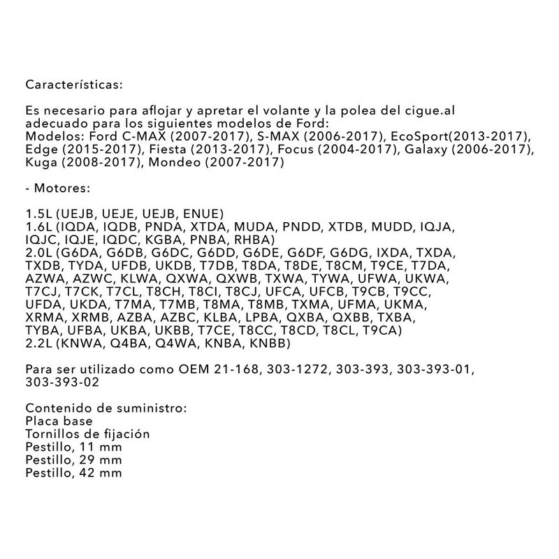En BGS TECHNIC MX ofrecemos a nuestros clientes herramientas de uso común y especializadas con los mas altos estándares de calidad vigentes en Europa a precios competitivos Herramienta De Bloqueo Del Volante | Para Ford | Bgs 9819 Características: Código universal de producto: 4026947098197 Condición del ítem: Nuevo Marca: Bgs Modelo: 9819 MPN: 9819 SKU: 9819 Tiempo de garantía: 2 meses Tipo de grantía: Garantía del vendedor Descripción Es necesario para aflojar y apretar el volante y la polea del cigüeñal Adecuado para los siguientes modelos de Ford: Modelos: Ford C-MAX (2007-2017), S-MAX (2006-2017), EcoSport (2013-2017), Edge (2015-2017), Fiesta (2013-2017), Focus (2004-2017), Galaxy (2006-2017), Kuga (2008-2017), Mondeo (2007-2017) Motores: 1.5L (UEJB, UEJE, UEJB, ENUE) 1.6L (IQDA, IQDB, PNDA, XTDA, MUDA, PNDD, XTDB, MUDD, IQJA, IQJC, IQJE, IQDC, KGBA, PNBA, RHBA) 2.0L (G6DA, G6DB, G6DC, G6DD, G6DE, G6DF, G6DG, IXDA, TXDA, TXDB, TYDA, UFDB, UKDB, T7DB, T8DA, T8DE, T8CM, T9CE, T7DA, AZWA, AZWC, KLWA, QXWA, QXWB, TXWA, TYWA, UFWA, UKWA, T7CJ, T7CK, T7CL, T8CH, T8CI, T8CJ, UFCA, UFCB, T9CB, T9CC, UFDA, UKDA, T7MA, T7MB, T8MA, T8MB, TXMA, UFMA, UKMA, XRMA, XRMB, AZBA, AZBC, KLBA, LPBA, QXBA, QXBB, TXBA, TYBA, UFBA, UKBA, UKBB, T7CE, T8CC, T8CD, T8CL, T9CA) 2.2L (KNWA, Q4BA, Q4WA, KNBA, KNBB) para ser utilizado como OEM 21-168, 303-1272, 303-393, 303-393-01, 303-393-02 Contenido de suministro: Placa base Tornillos de fijación Pestillo, 11 mm Pestillo, 29 mm Pestillo, 42 mm Si desea factura, favor de indicar el día de la compra de lo contrario por cuestiones fiscales, ya no sera posible proporcionarla y se genera como venta al publico en general
