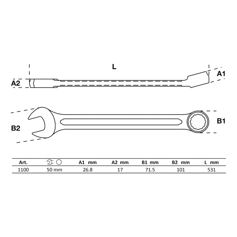 Llave Combinada, 50 Mm Forjado En Frío Cromado Mate Extremo Del Anillo En Ángulo De 15° Salida Del Anillo: 12 Caras Datos Tecnicos: Número De Modelo | Sku: 1100 Diseñado En: Alemania Marca: Bgs Peso Bruto: 2385 G Longitud: 531 Mm Material: Acero Al Cromo Vanadio Anchura De Llave 1: 50 Mm Anchura De Llave 2: 50 Mm
