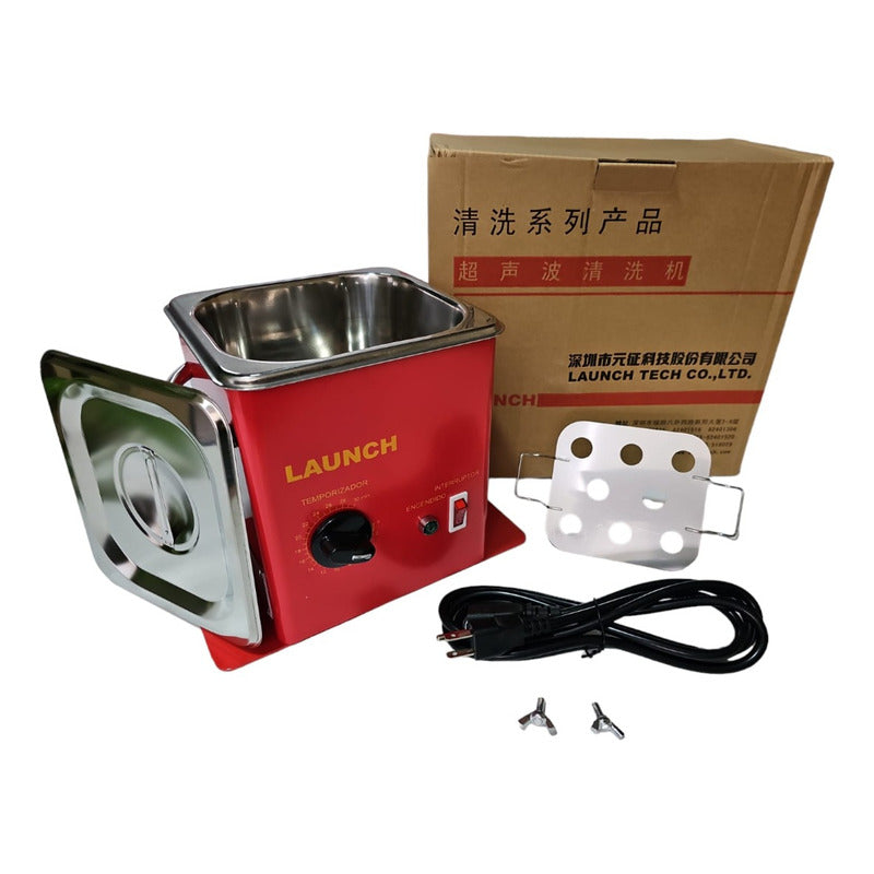 Tina de Limpieza Ultrasónica Automotriz Launch Tech Co (LTD) Características de la tina de ultrasonido: Capacidad interna de 1.2 litros. Temporizador de 0 - 30 Minutos. Medidas: 19.5 x 14.5 x 17 cm / Base 24 x 14.5 x .03 cm. Cuenta con canastilla porta inyectores para 8 unidades. Potencia: 100W. Frecuencia: 28 KHz. Voltaje: AC110V. Peso: 2.60 kilos. Contenido: * Tina de Ultrasonido. * Rejilla para lavado de inyectores. * Cable de Alimentación (110V). * Mariposa tornillo para Fijar Base de la Tina.