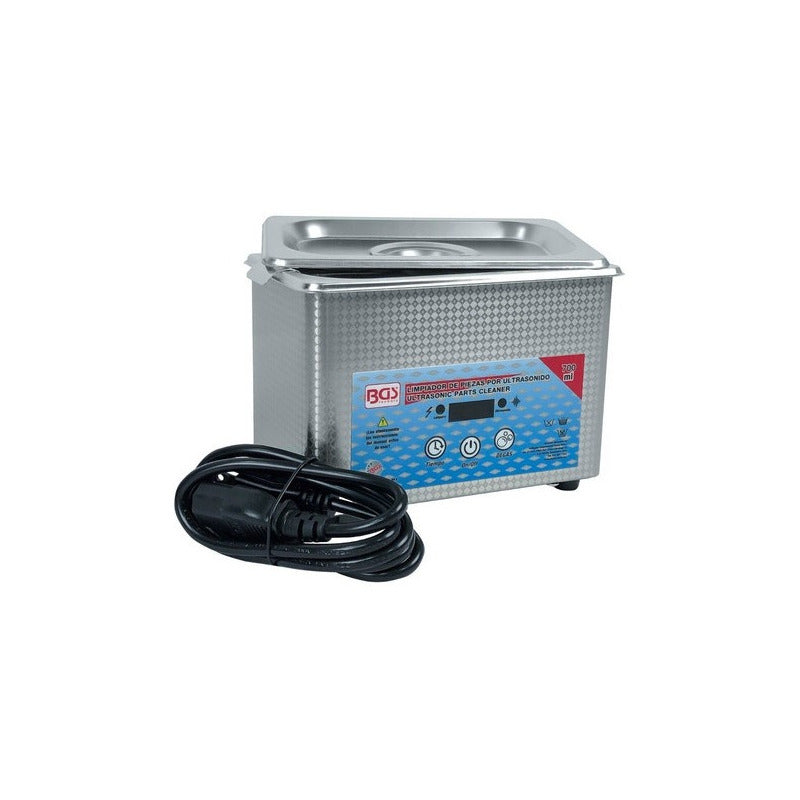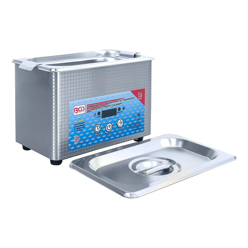 Tina / Limpiador Ultrasónico | 700 Ml | Bgs 630800-mx Bgs Características del producto: Código universal de producto: 7503029381141 Marca: Bgs Modelo: 630800-MX MPN: 630800-MX SKU: 630800-MX • Para la limpieza de piezas de carburadores, inyectores, etc. • Elimina eficazmente la suciedad • Carcasa, recipiente y tapa de acero inoxidable (a prueba de óxido) • Tamaño del depósito: 154 x 88 x 65 mm • Potencia del ultrasonido: 35 vatios • Ajuste del tiempo: 0-30 min (18 escalas de tiempo) • Frecuencia del ultrasonido: 42 kHz