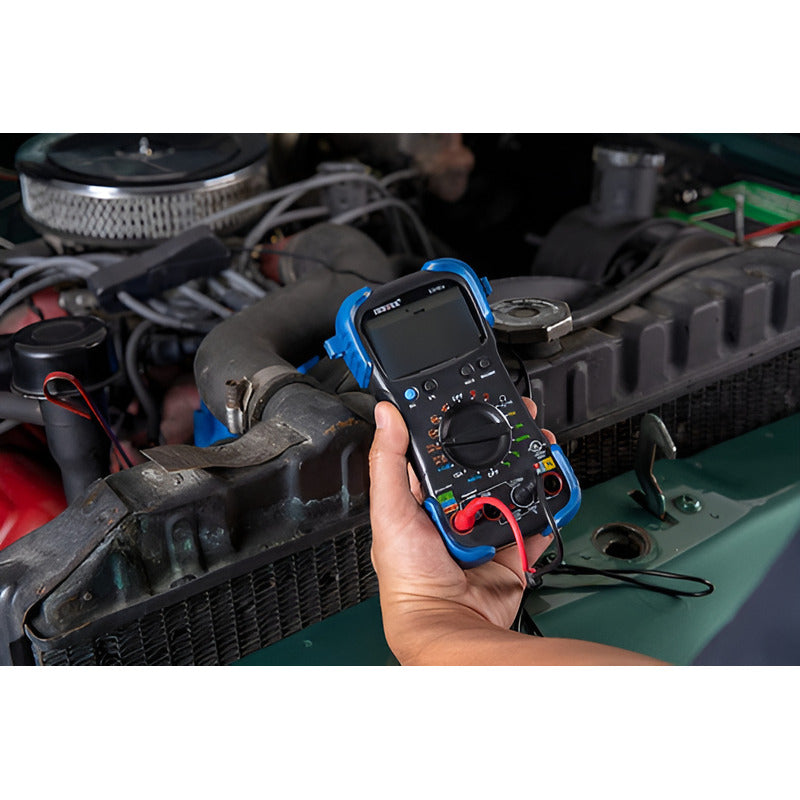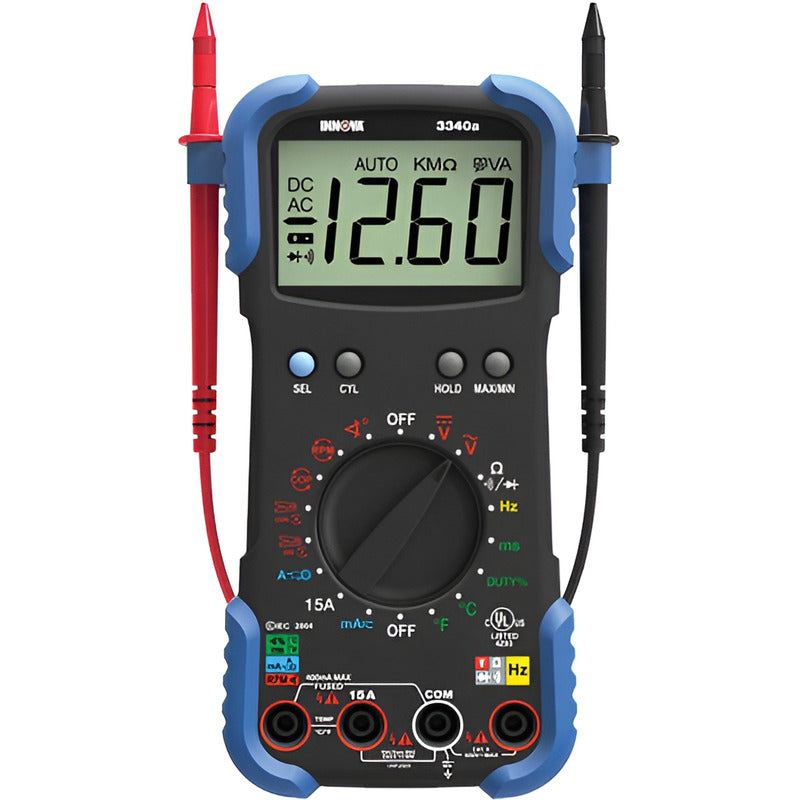Descripción del producto: El multímetro de rango automático Innova 3340 cuenta con una sonda de temperatura para recuperar y mostrar temperaturas tanto en Celsius como en Fahrenheit, lecturas de RPM del vehículo (incluidos vehículos con bobina en bujía) con captación inductiva incluida, ajustes automáticos a cero y protección contra polaridad inversa. El 3340 es excelente para probar diodos de alternador, ciclo de trabajo, solenoides, puntos de interrupción, cableado, interruptores y más. Diseñado para identificar problemas del motor; prueba diodos de alternador, ciclo de trabajo, solenoides, puntos de interrupción, cableado, interruptores y más Cuenta con rango automático, apagado automático y protección contra sobrecarga Mide hasta 15 amperios para probar dispositivos impedancia de entrada de 10 megaohmios; seguro para uso eléctrico y automotriz; evita daños en la ECU del vehículo Uno para la caja de herramientas del técnico automotriz, el multímetro INNOVA 3340 es bueno para probar todo, desde voltios, amperios y resistencia hasta diodos de alternador, RPM, ángulo de permanencia y temperatura. Fue diseñado específicamente para diagnosticar problemas del motor y, aunque no está diseñado como reemplazo de instrumentos de taller profesionales dedicados, es excelente como una herramienta diaria y para el aficionado Este es un multímetro decente para electricistas y técnicos de motores, con años de uso comprobado en el campo. Aunque está diseñado para el mercado automotriz, también realiza bien las mediciones eléctricas estándar, con rangos de entrada que incluyen voltaje de CA y CC, miliamperios de CA y CC, amperios de CC, resistencia, continuidad, frecuencia y más. Las pruebas del motor del vehículo cuentan con una salida del alternador, verificaciones de RPM para sistemas de encendido convencionales y sin distribuidor, y verificación de tacómetro. La abrazadera incluida es un buen toque para revisar los cables de encendido (manos libres) y es útil para vehículos más antiguos. También puede verificar el voltaje de la batería con el INNOVA 3340, así como las temperaturas de la sonda para leer Fahrenheit y Celsius. Este es un multímetro de rango automático, por lo que simplemente puede seleccionar una entrada determinada con el dial y el medidor hará el resto. El rango automático generalmente es más lento para mostrar que una versión equivalente de rango manual, ya que necesita más tiempo para funcionar.