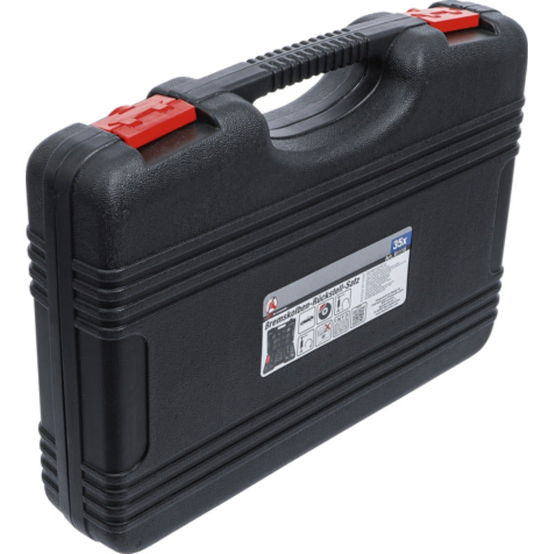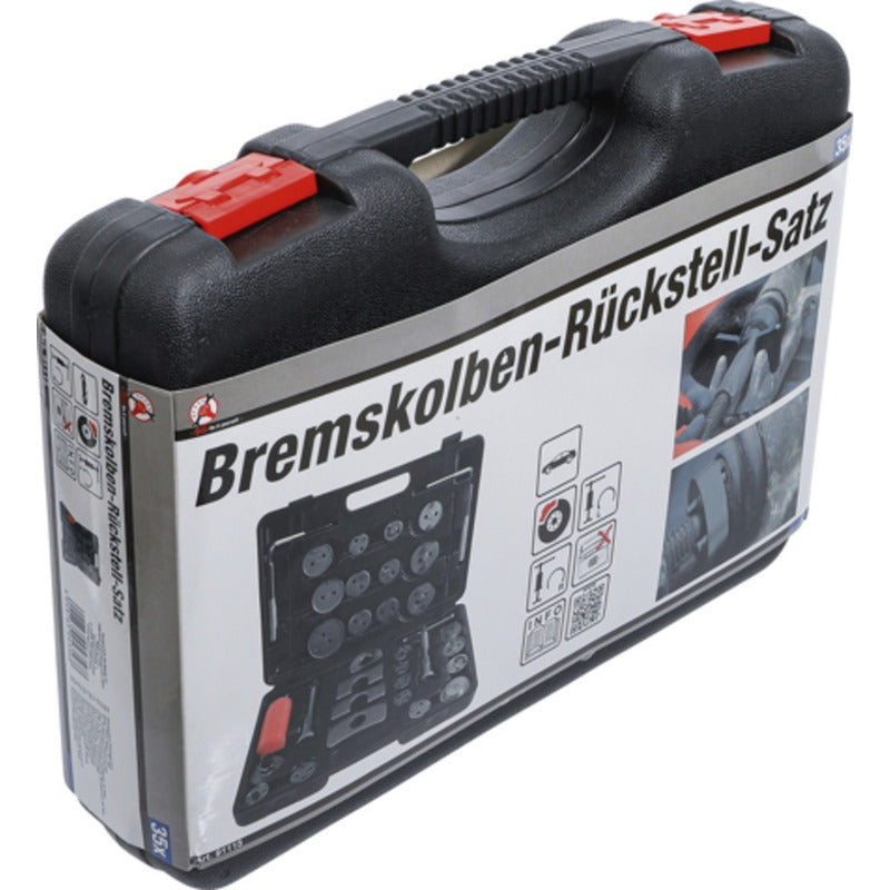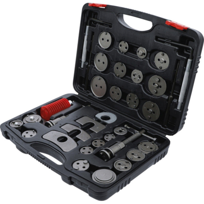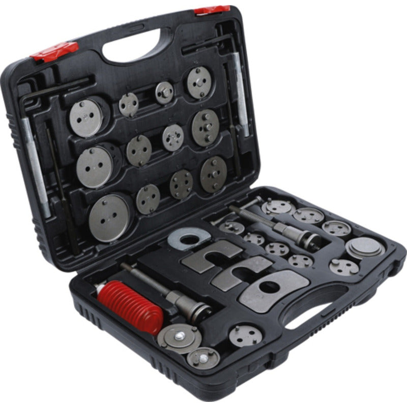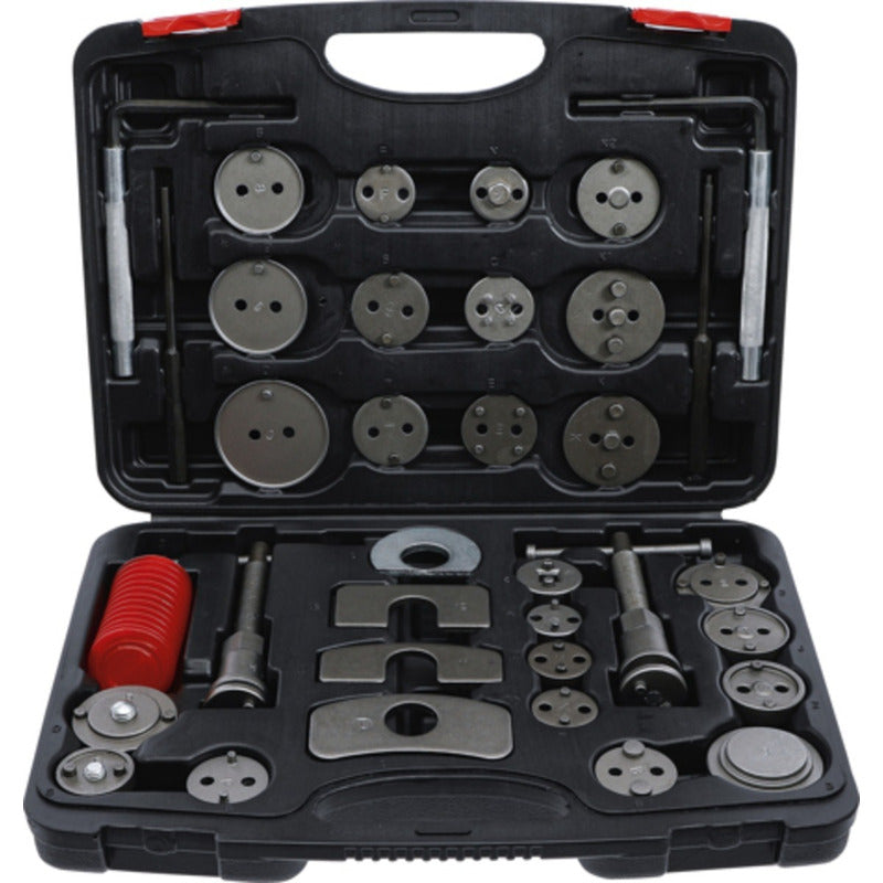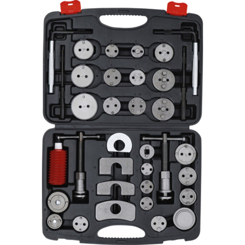 BGS JUEGO DE REPOSICIONADORES DE PISTONES DE FRENO CON 35 PIEZAS Características: Para reajuste manual del pistón de freno por ej. al sustituir los forros de freno Adecuado para pinzas de freno en eje delantero y trasero, con y sin función de freno de mano (No adecuado para modelos con freno de mano eléctrico) Husillos con rosca a la izquierda y derecha respectivamente Tubo vacío para grasa de husillo, para un trabajo suave con los husillos de reposicionamiento del pistón de freno Placa de apoyo, cerrada, Semi Redonda Placa de apoyo, cerrada, redonda con entalladura Placa de apoyo, abierta, rectangular Placa de apoyo, abierta, Semi Redonda Punzón Ø 3 y 5 mm Llaves Allen 6 y 8 mm 24 adaptadores Re-posicionadores de pistón de freno, adecuados para La mayoría de los modelos, por ejemplo.: Alfa Romeo, Audi, BMW, Citroen, Fiat, Ford Australia, Europa, USA, General Motors (GM), Honda, Isuzu, Jaguar, Lancia, Mazda, Mercedes- Benz, MINI, Mitsubishi, Nissan, Opel, Peugeot, Proton, Renault, Rover, Saab, Seat, Subaru, Toyota, Volkswagen, Volvo