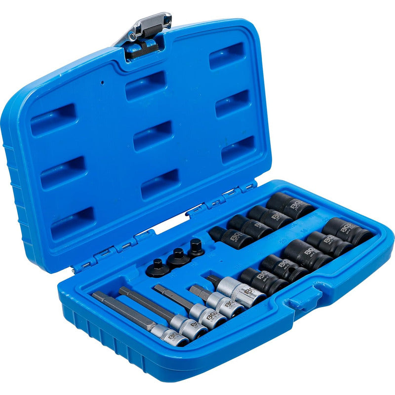BGS 74283 SET DE DADOS & PUNTAS ESPECIALES PARA CALIPER DE FRENO CON 17 PIEZAS • Juego de dados y puntas para caliper de freno de 17 piezas • Para desmontar los calipers de freno al reemplazar las pastillas de freno • Aplicaciones: • Audi A4, A5, S5, Q5, Q7, S8 • Porsche Cayenne, Macan, Cayman • Mercedes Benz • Ford • BMW • Alfa Romeo • 7 piezas de dados hexagonales de impacto: • 1 dado hexagonal de perfil bajo con cuadro de 1/4” de 9 mm x 20 mm, material: CR-MO. para Mercedes-Benz ML320 y otros. • 2 dados hexagonales de 7 mm y 8 mm x 24 mm con cuadro de 3/8”, material: CR-MO. para Mercedes-Benz Clase C, Audi TT (2007-), A4 (2001-), A6 (2005-), A8 (2003-) además de otros. • 1 x dado hexagonal de 3/8” de 9 mm x 50 mm, material: CR-V. para Mercedes-Benz, BMW, Jaguar XF. • 2 x 3/8” Drive 7 mm x 72 mm, dado hexagonal de 7 mm x 92 mm, material: CR-V. para BMW 3 / 5 con chasis E36.| Ford Mondeo, Fiesta, Alfa Romeo, Vauxhall, Volkswagen, SAAB, Chrysler, BMW Mini, etc. • 1 dado hexagonal de 3/8” de 11 mm x 100 mm, material: CR-V. Para uso en inyectores diésel, incluye pasadores deslizantes de pinza de freno Mercedes ML, Ford Focus y Edge. • Juego de dados para pinza de freno especial de 5 piezas: • 1 x 1/2” Drive 11.5mmx38mm, material: CR-V. Llave de vaso de 10 puntos para uso en pernos de pinza de freno en Porsche. • 1 x 1/2” Drive 15mmx38mm, material: CR-V. Vaso de pastilla de freno de 10 puntos para uso en Audi Q7, S8 y Porsche Macan, Cayenne, Cayman. • 1 x 1/2” Drive 20mmx38mm, material: CR-V. Vaso de pastilla de freno de 10 puntos para uso en Audi A8, S6 y Porsche Cayenne. • 1 x 1/2” Drive 22mmx38mm, material: CR-V. Vaso de 7 puntos para uso en pernos de pinza de freno en Audi S5. • 1 x entrada de 1/2” 14 mm x 38 mm, material: vaso CR-V.7pt para usar en Audi A5, A6L, Q5, Q7 a partir de 2017 • Cuadro de 4 piezas de 1/2”Dados del Pentágono: 10MM -12.5MM -14MM-19MM, material: CR-V. • 1 unidad de 10 mm con broca de 1/2”, material: CR-V.