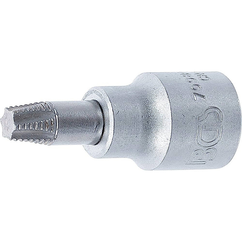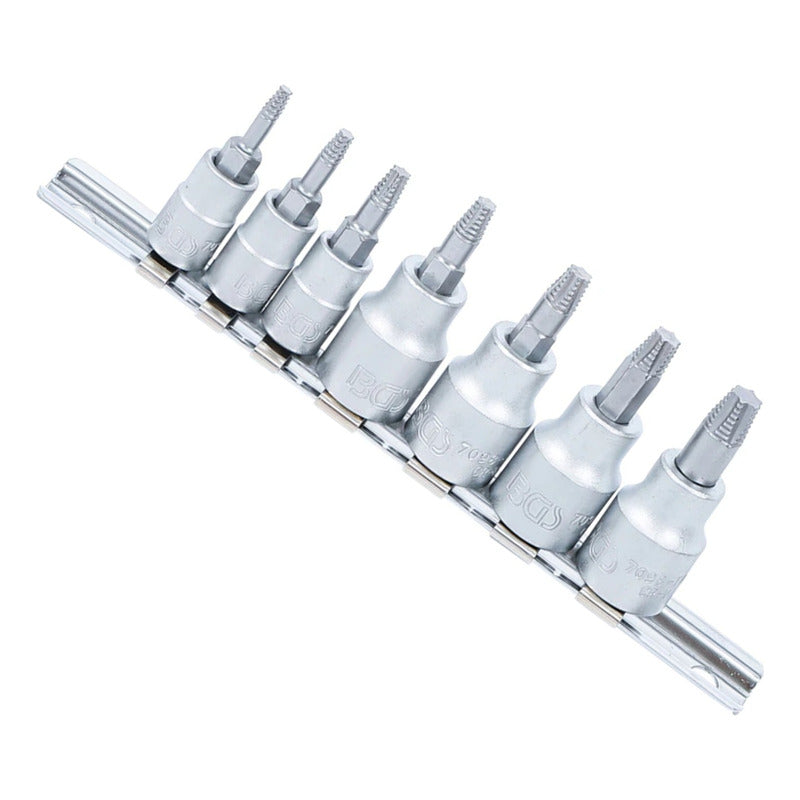 BGS 7098 JUEGO DE EXTRACTORES DE TORNILLOS ENTRADA 6,3 MM (1/4”) / 10 MM (3/8”) PARA PERFIL EN T (PARA TORX) DEFECTUOSO | T10 - T40 | 7 PIEZAS Para extraer tornillos con cabezas defectuosas de perfil en T (para Torx) • Permite aflojar con seguridad el perfil de accionamiento que ya no puede ser utilizado o que está dañado • Rosca especial de corte con giro a la izquierda con bordes de corte cónicos • Para el funcionamiento manual • En riel metálico Contenido de suministro: • 1 Dado con punta | 6,3 mm (1/4”) | para perfil en T (para Torx) defectuoso | T10 (BGS 7098-T10) • 1 Dado con punta | 6,3 mm (1/4”) | para perfil en T (para Torx) defectuoso | T15 (BGS 7098-T15) • 1 Dado con punta | 6,3 mm (1/4”) | para perfil en T (para Torx) defectuoso | T20 (BGS 7098-T20) • 1 Dado con punta | entrada 10 mm (3/8”) | para perfil en T (para Torx) defectuoso | T25 (BGS 7098-T25) • 1 Dado con punta | entrada 10 mm (3/8”) | para perfil en T (para Torx) defectuoso | T27 (BGS 7098-T27) • 1 Dado con punta | entrada 10 mm (3/8”) | para perfil en T (para Torx) defectuoso | T30 (BGS 7098-T30) • 1 Dado con punta | entrada 10 mm (3/8”) | para perfil en T (para Torx) defectuoso | T40 (BGS 7098-T40)