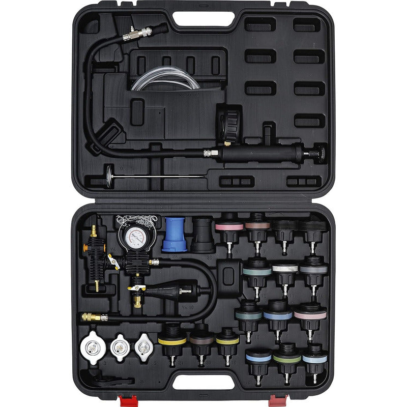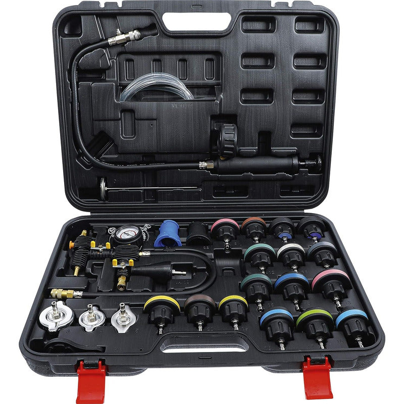 BGS 98098 PROBADOR DE PRESIÓN DE RADIADOR & LLENADO SET DE 27 PIEZAS Descripción: Para la prueba de fugas y el llenado de sistemas de refrigeración Facilita la detección de fuga y permite un llenado fácil y sin burbujas, incluso en sistemas de enfriamiento difíciles de llenar. -Incluye: 1x bomba de presión 1x termómetro 1x manguera de llenado 1x unidad de llenado con manómetro de vacío 2x adaptadores para la tapa del radiador, para prueba de fugasy presión. 3x adaptadores de radiador , para prueba de fugas y presión adecuado para muchos vehículos con tapas de radiador 15x adaptadores para tanques de compensación para prueba de fugas y llenado, adecuado para casi todos los vehículos con depósito de compensación 1x llave de anillo para apretar / aflojar los adaptadores Detalles Técnicos: Peso bruto: 6080 gr