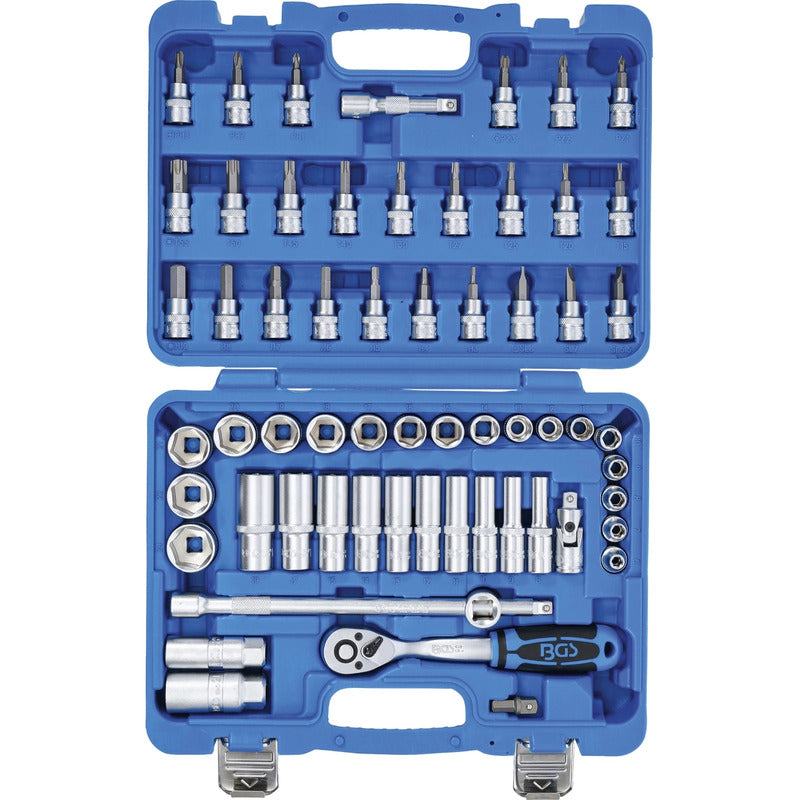 Juego De Dados Hexagonales | Entrada 10 Mm (3/8") | 61 Piezas Contenido De Suministro: Herramientas Con Entrada 10 Mm (3/8") Matraca, Dentado De Precisión, 72 Dientes Extensión, 75 Mm Adaptador De Mango Corredizo Articulación Cardánica Adaptador Hexagonal 8 Mm Dados Para Bujías 16 + 21 Mm 18 X Dados, Hexagonal: 6 - 7 - 8 - 9 - 10 - 11 - 12 - 13 - 14 - 15 - 16 - 17 - 18 - 19 - 20 - 21 - 22 - 24 Mm 10 X Dados, Hexagonal, Largas: 8 - 9 - 10 - 11 - 12 - 13 - 14 - 15 - 17 - 19 Mm 25 X Puntas De Dado Perfil Plano 5,5 - 7 - 8 Mm Cruz Ph1 - Ph2 - Ph3 Cruz Pz1 - Pz2 - Pz3 Hexágono Interior 3 - 4 - 5 - 6 - 7 - 8 - 10 Mm Perfil En T (Para Torx) T15 - T20 - T25 - T27 - T30 - T40 - T45 - T50 - T55 Datos Tecnicos: Número De Modelo | Sku: 2218 Diseñado En: Alemania Marca: Bgs Peso Bruto: 4238 G Material: Acero Al Cromo Vanadio