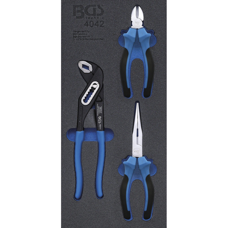 Bandeja Para Gabinete 1/3: Juego De Pinzas | 3 Piezas Contenido De Suministro: Pinzas De Corte Diagonal Tipo Sueco 165 Mm Mango De 2 Componentes Pinzas De Teléfono Rectos, 200 Mm Mango De 2 Componentes Pico De Loro Con Articulación Pasante, 240 Mm, Apertura Máx. De La Pinza 38 Mm Forjada, Lacada En Negro Mangos Aislados Por Inmersión Datos Tecnicos: Número De Modelo | Sku: 4042 Diseñado En: Alemania Marca: Bgs Anchura: 189 Mm Peso Bruto: 888 G Altura: 32 Mm Longitud: 408 Mm Material: Acero Al Cromo Vanadio Acabado De Superficie: Cromado, Mate