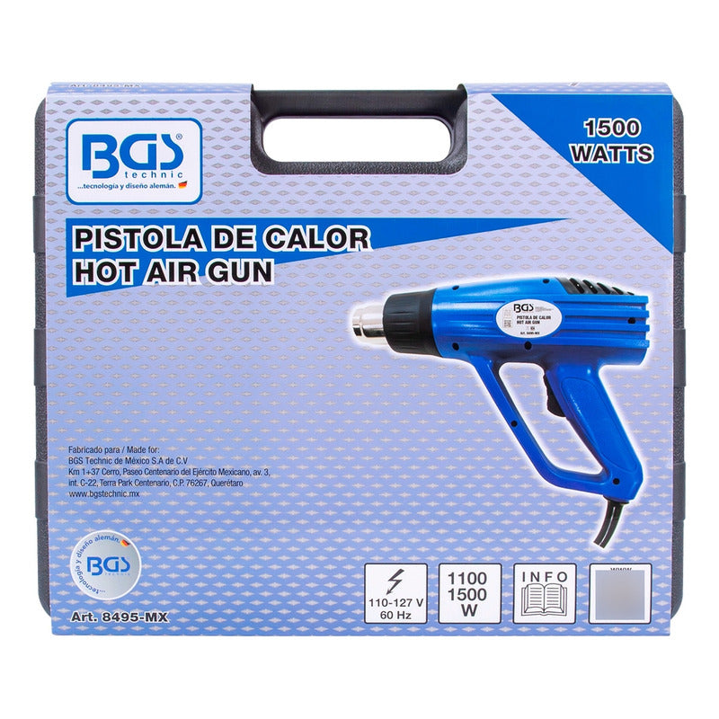 En BGS TECHNIC MX ofrecemos a nuestros clientes herramientas de uso común y especializadas con los mas altos estándares de calidad vigentes en Europa a precios competitivos Pistola De Calor Con Accesorios | 1200 W | Bgs 8495-mx Bgs Características: Cantidad de accesorios: 5 Código universal de producto: 7500326704765 Color: Azul Condición del ítem: Nuevo Embalaje del envío: Auto-despachable Incluye estuche: Si Marca: Bgs Modelo: 8495-MX MPN: 8495-MX Potencia: 1200 Watts SKU: 8495-MX Tiempo de garantía: 1 años Tipo de grantía: Garantía de fábrica Voltaje: 1200 W Kit de Pistola de calor | 1200 W | Con accesorios Bgs 8495-MX Soldadura de cables no aislados y terminales de cable Afloja uniones de soldadura sin aislamiento Conformado y soldadura de plásticos Secado de superficies Aceleración de procesos adhesivos Descongelamiento de escaleras, peldaños, cerraduras de puertas, etc. Decapado de pinturas viejas Desinfección de superficies Calentamiento para montaje de piezas de motores y cajas de velocidades Temperatura Max 495°C Potencia 1200W Tensión de red (AC) 120 V SI DESEA FACTURAR FAVOR DE INDICAR EL DÍA DE LA COMPRA Si desea factura, favor de indicar el día de la compra de lo contrario por cuestiones fiscales, ya no sera posible proporcionarla y se genera como venta al publico en general