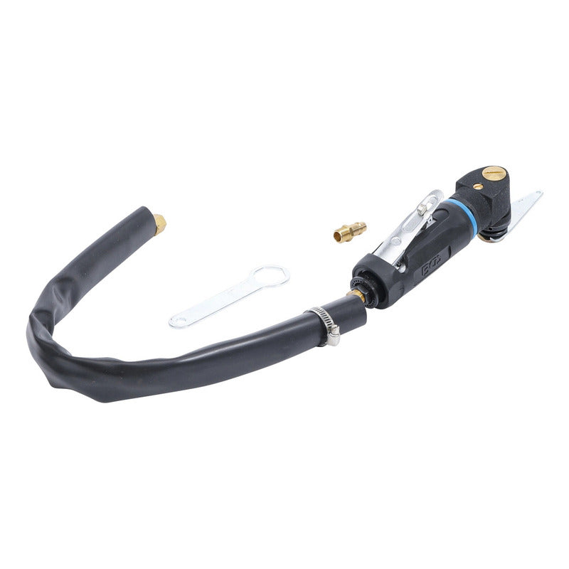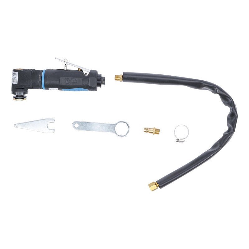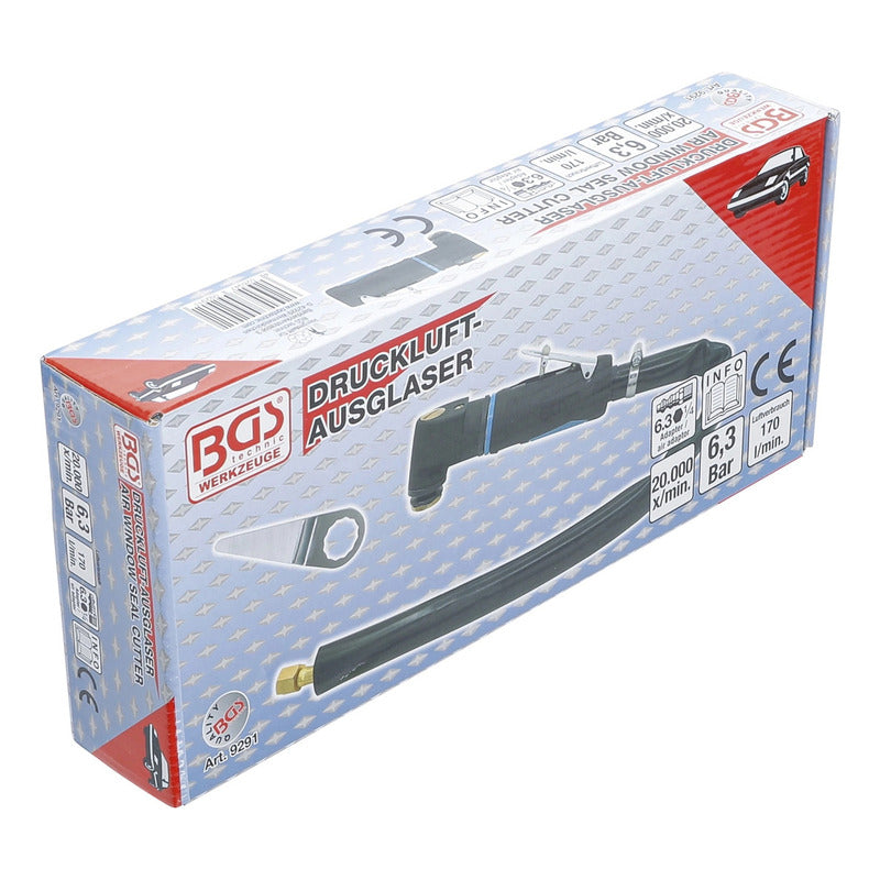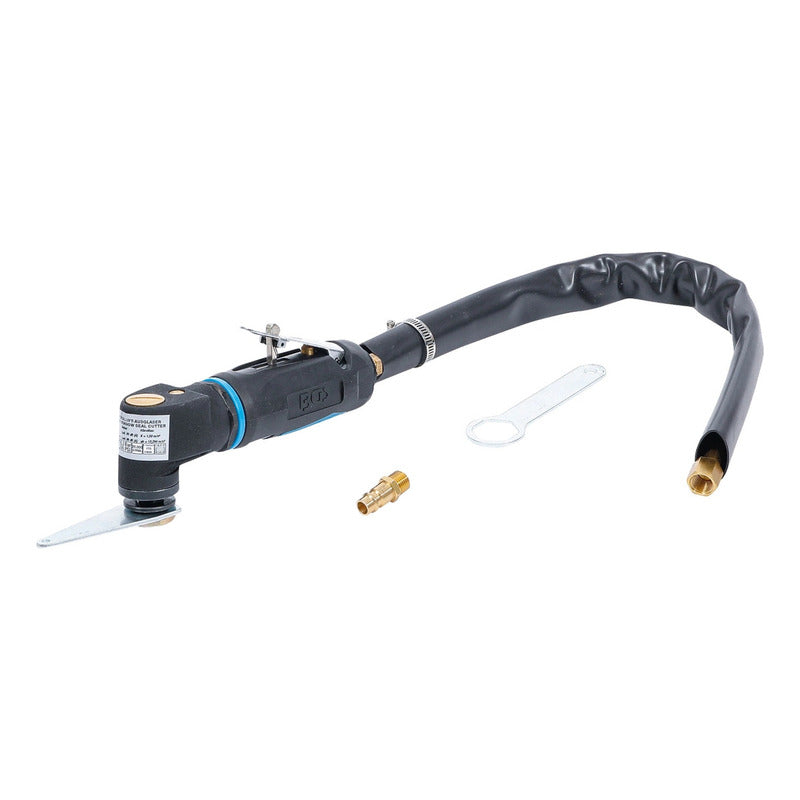 Descripción: Sacalunas Neumático para el corte del sellado de las lunas de vehículos incluye una cuchilla de corte (BGS 3219) oscilación 20.000 anchura de corte 76 mm conexión de aire comprimido 6,3 mm (1/4'') manguera de aire comprimido 10 mm consumo de aire promedio 170 l/min presión de trabajo 6,3 bar (90 psi) nivel de ruido LpA= 85 dB(A) / LwA= 96 dB(A) vibración ah = 10,294 m/s² / K = 1,5 m/s² Datos tecnicos: Número de modelo | SKU: 9291 Diseñado en: Alemania Marca: BGS Peso bruto: 1318 g