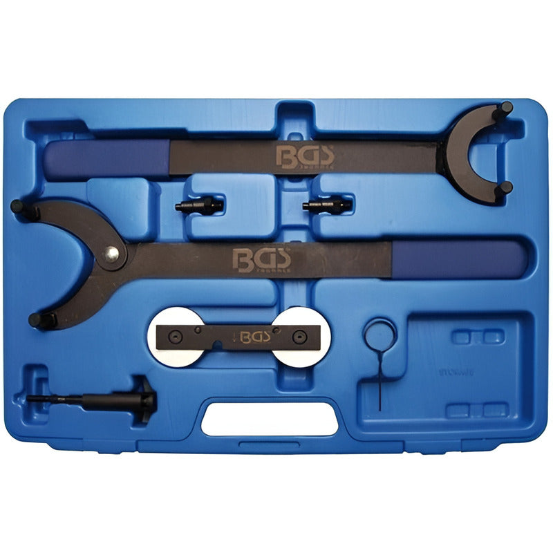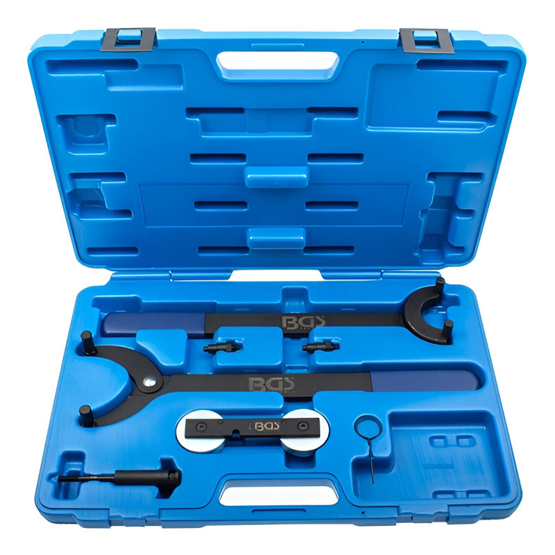 BGS 8261 Kit de sincronización para motores VW / Audi FSI 1.4, 1.6 y 1.8 Lts Turbo Adecuado para motores FSI 1.4, 1,8L y 1,6 Lts Turbo (TFSI) Similar al OEM3036 Reglaje del árbol de levas similar al OEMT10171 Bloqueo del piñón de la cadena de distribución, árbol de levas, el amortiguador similar al T10172OEM Adaptadores para bloqueo similar al T10172OEM Soporte para el ajuste, montaje y desmontaje de la cadena de ajuste similar al OEMT20018/3366 Para los siguientes modelos de coches Audi: A3 1.8 Turbo (AGN, AGU, ajq, APG, AQA, APP, ARX, ARY, ARZ, AUM, AUQ) 1996-2003 A3 1.6 FSI (BAG) 2003-2006 S3 1,8 Turbo (AMK, APY, BAM) 1996 A4 1.8 Turbo (ADR, AEB, AJL, AJP, ANB, APU, AVJ, AWT) desde 1994 hasta 2006 A6 1.8 Turbo (ADR, AEB, AJL, AJP, ANB, APU, AVJ, AWT) desde 1994 hasta 2006 Cabriolet 1.8 (ADR) 1997-2000 TT 1.8 Turbo (APP, ajq, APX, AUM, AUQ, BAM) 1998-2006 Volkswagen: Beetle 1,8 Turbo (AVC) 1999-2006 Touran 1.6 FSI (BLP, BAG) 2003-2007 Golf 1.8 Turbo (AGN, AGU, AQA, ARZ, AUM, AUQ) desde 1997 hasta 2005 Bora 1.8 Turbo (AGN, AGU, AQA, ARZ, AUM, AUQ) desde 1997 hasta 2005 Passat 1.8 Turbo (ADR, AEB, ANB, APT, APU, ARG, AWT) 1996-2005 Seat: Sharan 1.8 Turbo (AJH, AWC) 1997 a 2007 Ibiza 1.8 Turbo (AQX, AYP) 1999-2002 Córdoba 1,8 Turbo (AQX, AYP) 1999-2002 Leon 1.8 Turbo (ajq, AQN, APG, ARY, AUQ, APP, APT) 1999-2005 Toledo Turbo (APG, AQN, APT, AUQ, ARY) 1999-2005 Alhambra 1,8 Turbo (AJW, AWC) 1997 a 2007