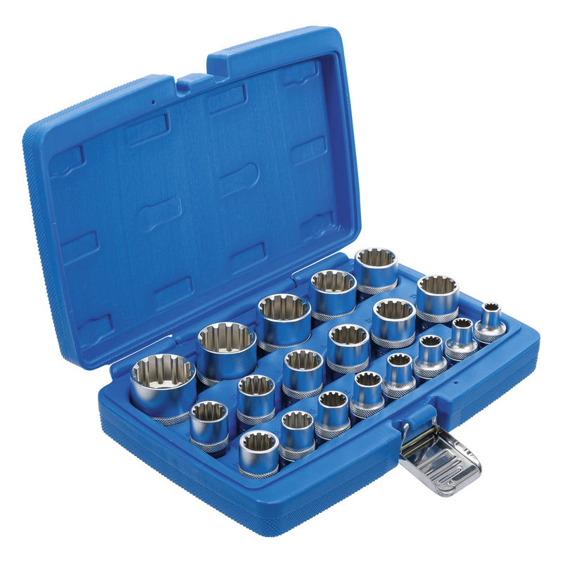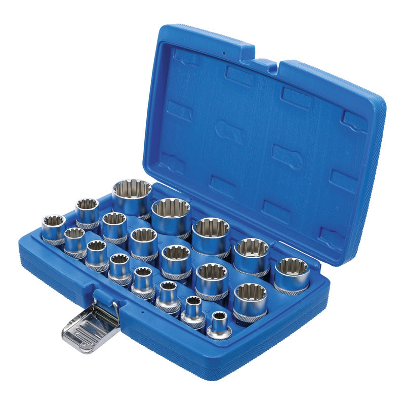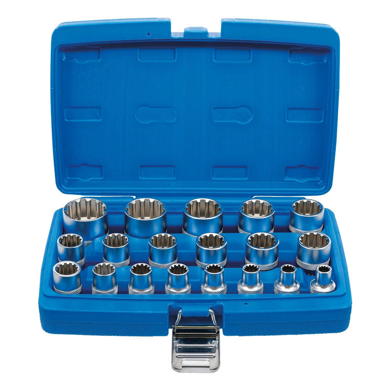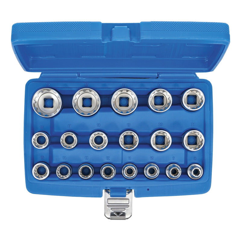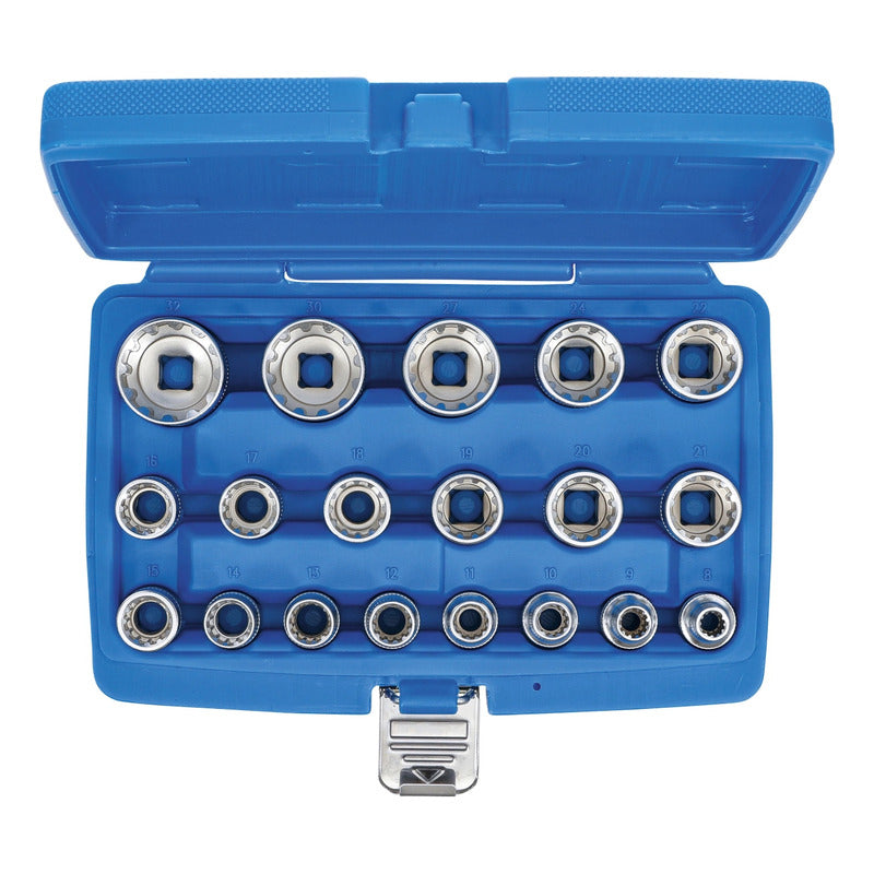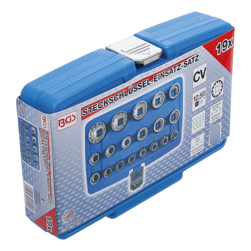 DESCRIPCIÓN: JUEGO 19 PIEZAS MULTIUSOS 1/2" MEDIANTE SU PERFIL GEAR LOCK PERMITEN UN USO UNIVERSAL PARA HEXAGONAL, 12 CARAS, E-TORX, EN MÉTRICA Y PULGADAS TANTO PARA DADOS HEXAGONALES COMO DE 12 CARAS ESTRIADO 8 - 9 - 10 - 11 - 12 - 13 - 14 - 15 - 16 - 17 - 18 - 19 - 20 - 21 - 22 - 24 - 27 - 30 - 32 MM TAMBIÉN APTO PARA: PERFILES E-TORX: E10 - E12 - E14 - E16 - E18 - E20 - E22 - E24 MEDIDAS EN PULGADAS: 5/16" - 11/32" - 3/8" - 7/16" - 15/32" - 1/2" - 9/16" - 19/32" - 5/8" - 3/42" - 25/32" - 13/16" - 7/8" - 15/16" - 1-1/16" - 1-3/16" - 1-1/4" DATOS TECNICOS: NÚMERO DE MODELO | SKU: 2152 DISEÑADO EN: ALEMANIA MARCA: BGS PERFIL DE FUNCIONAMIENTO: GEAR LOCK (MULTIPERFIL) TAMAÑO DEL PERFIL DE ACCIONAMIENTO, SISTEMA ANGLOSAJÓN: 1/2 " TAMAÑO DEL PERFIL DE ACCIONAMIENTO, SISTEMA MÉTRICO: 12,5 MM PESO BRUTO: 1992 G MATERIAL: ACERO AL CROMO VANADIO